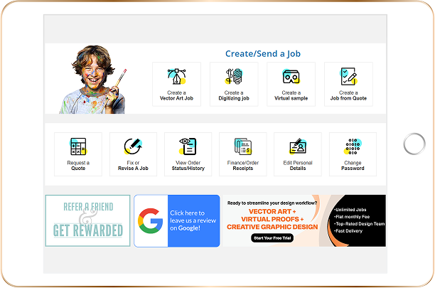 To create a job, register and log in to your account. Once logged in, you can submit a job by selecting the job type (logo, layout, complex artwork, etc.) and the service you need.